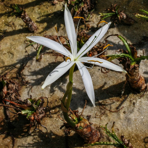 Crinum calamistratum is an aquatic plant native to Africa. Long flowing leaves with tightly undulating margins are the highlight of this striking plant. Crinum calmistratum is best used as a centerpiece for display in the aquarium. Like other Crinum sp. Crinum calamistratum has a bulb to help it last through periods of low water in the natural environment and can even grow completely emersed in very humid conditions. Crinum calamistratum has large white flowers and typically flowers while emersed although it will sometimes flower in the aquarium, sending its lovely bloom up above the water surface for some lucky aquarists.