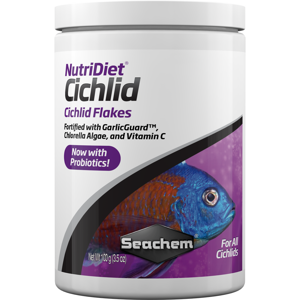NutriDiet® Cichlid Flakes are formulated to provide all essential nutrients for all Cichlids. The diet focuses on a high Chlorella Algae content. Chlorella Algae is an exceptional source of a broad range of vitamins, amino acids, as well as all other nutrients required for all animal life. It is considered a potential super food that far surpasses the nutrients delivered by Spirulina Algae common to other diets. Additionally, Cichlid Flakes contain GarlicGuard™ as an appetite stimulant.